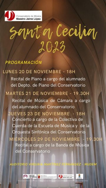 La Concejalía de Educación del Ayuntamiento de Molina de Segura, a través del Conservatorio de Música Maestro Jaime López de Molina de Segura, organiza varias actividades musicales con motivo de la festividad de Santa Cecilia 2023 (22 de noviembre), patrona de la música, del lunes 20 al miércoles 29 de noviembre, en el Auditorio Virginia Martínez Fernández, en el MUDEM. La entrada es libre hasta completar aforo.