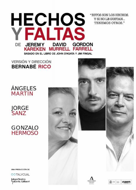 Tal y Cual Producciones (Sevilla) presenta HECHOS Y FALTAS, obra de Jeremy Kareken, David Murrell y Gordon Farrell, basada en el libro de John D'Agata y Jim Fingal, versionada y dirigida por Bernabé Rico, y protagonizada por Ángeles Martín, Jorge Sanz y Gonzalo Hermoso, el viernes 9 de febrero, a las 20.00 horas, en el Teatro Villa de Molina (en Avenida del Chorrico, n° 10). El precio de la entrada es de 15 euros. Espectáculo subvencionado por el Instituto de las Industrias Culturales y las Artes (ICA) de la Región de Murcia.