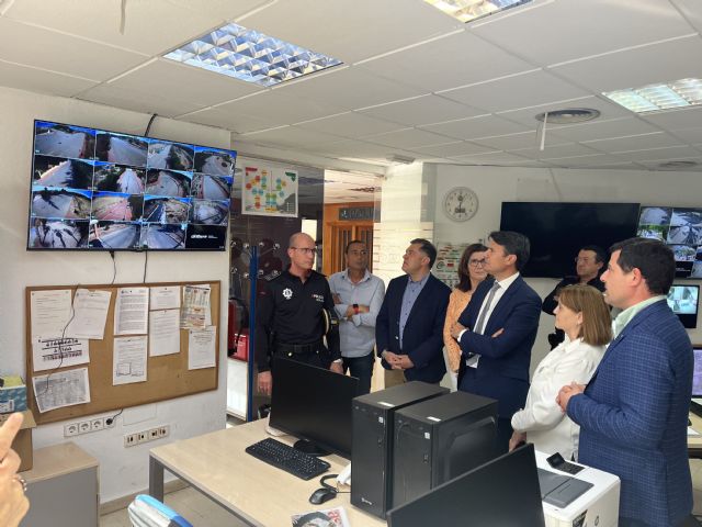 El alcalde de Molina de Segura, José Ángel Alfonso, junto al concejal de Seguridad Ciudadana y Policía Local, Antonio Martínez; el edil de Tecnologías de la Información y la Comunicación, Fran Hernández; la concejala de Urbanizaciones, Paloma Blanco, y la presidenta de la Entidad Urbanística de Montepríncipe, María Trives Cano, han visitado esta tarde el cuartel de Policía Local con motivo de la entrada en funcionamiento de la pantalla de visionado de las cámaras de vigilancia de la urbanización Montepríncipe.