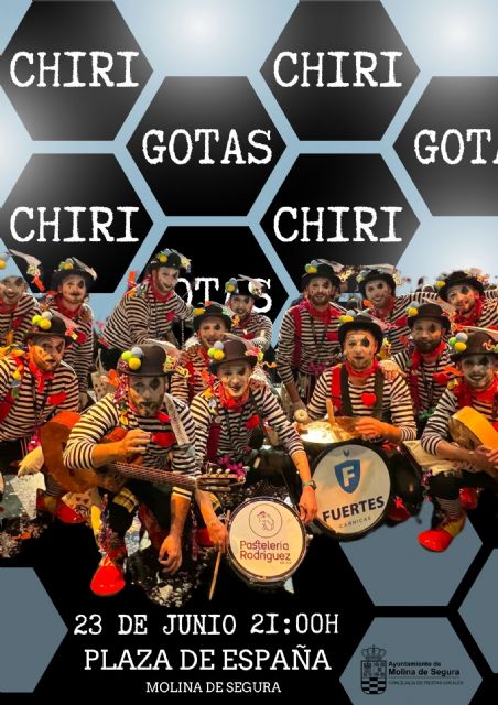 El Ayuntamiento de Molina de Segura a través de la Concejalía de Fiestas locales, organiza el evento cultural y festivo Chirigotas, que tendrá lugar el domingo 23 de junio, a las 21.00 horas, en la Plaza de España. En esta ocasión, contará con las actuaciones de la Agrupación Músico-Cultural Chirigotera de Cabezo de Torres, la Asociación Chirigota El Jallullo de Totana, y con la colaboración especial de la Chirigota del Colegio San Antonio.