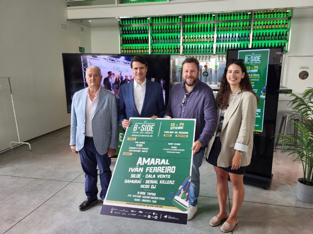 A las 12h, en la Sala de Catas de Estrella de Levante, se ha llevado a cabo el acto de presentación oficial de la XIX edición del Festival de Música Independiente B SIDE 2024 de Molina de Segura (Murcia) con las intervenciones del alcalde de Molina de Segura, José Ángel Alfonso, el concejal de Fiestas Locales, Juan de Dios García, el director de Comunicación y Relaciones Externas de Estrella de Levante (patrocinador principal), Yayo Delgado, y la portavoz del B-Side Festival, Virginia Pastor.