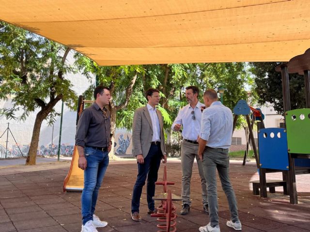 El alcalde de Molina de Segura, José Ángel Alfonso, acompañado por concejal de Participación Ciudadana, Antonio Martínez, y el concejal de Vía Pública, Sergio Bernal, ha visitado hoy viernes varios enclaves del municipio en los que se han realizado las actuaciones de colocación de velas de sombraje para proteger a los niños y familias que disfrutan de los parques infantiles de Molina de Segura. En uno de ellos, el Parque Rafael Pastor El Cordeta, junto al CEIP Maestro Francisco Martínez Bernal, han finalizado recientemente las obras de instalación de dichas velas de sombra sobre el área infantil existente en ese parque, así como las mejoras en el cerramiento perimetral del mismo.
