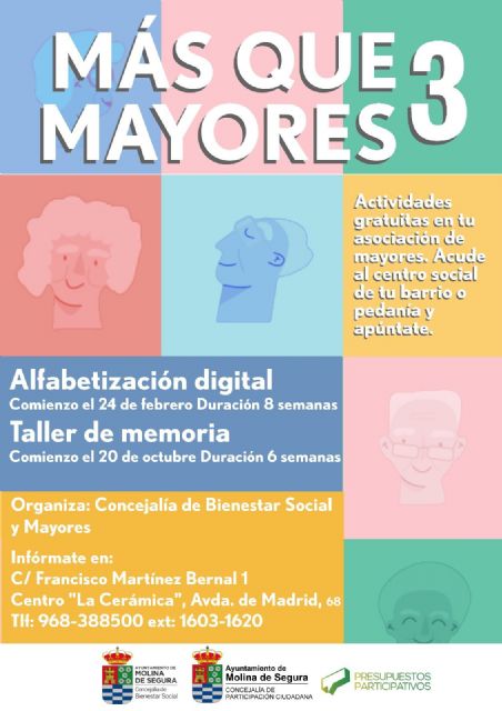 Las actividades están dirigidas a las personas mayores de 65 años, que pueden solicitar información o inscribirse en el centro social de su barrio o pedanía o en la Unidad de Mayores del Ayuntamiento de Molina de Segura, ubicada en Calle Francisco Martínez Bernal, n° 1, bajo (atención al público martes y jueves).