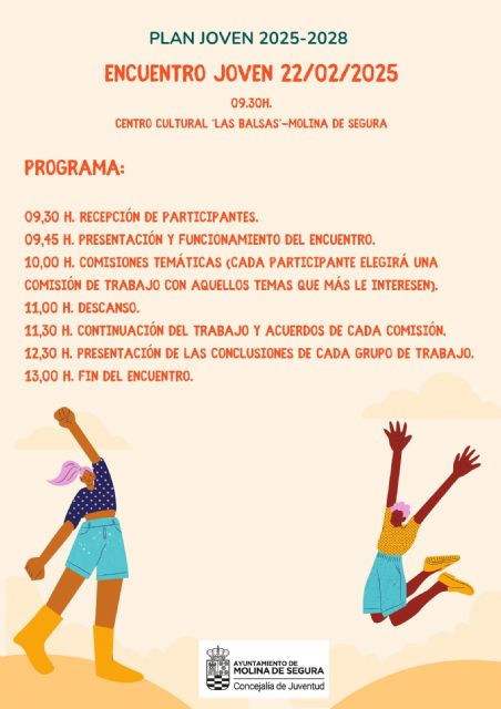 El encuentro tendrá lugar el sábado 22 de febrero, a partir de las 09.30 horas, en el Centro Las Balsas (en Calle Cartagena, junto a Plaza de los Grifos). Podrá inscribirse cualquier joven del municipio que esté interesado en participar, así como profesionales y personal técnico que trabajen con este perfil de población en Molina de Segura. A lo largo de la jornada podrán aportar su experiencia en las distintas comisiones de trabajo.
