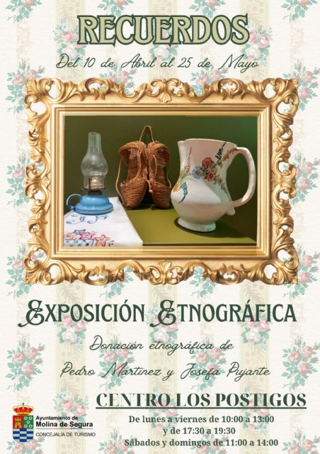 La exposición etnográfica Recuerdos, conformada a partir de donaciones efectuadas por Pedro Martínez y Josefa Pujante, y organizada por la Concejalía de Turismo del Ayuntamiento de Molina de Segura, abre al público del 10 de abril al 25 de mayo, en la Sala de Exposiciones del Centro Los Postigos (en Calle Pensionista, n° 3). El acto de inauguración tendrá lugar el jueves 10 de abril, a las 19.00 horas, y contará con la asistencia de la concejala de Turismo, Pilar Galindo. La muestra podrá visitarse: por las mañanas, de lunes a viernes, de 10.00 a 13.00 horas, y sábados y domingos, de 11.00 a 14.00 horas; y por las tardes, de lunes a viernes, de 17.30 a 19.30 horas.