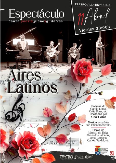 El Ciclo Músicas Clásicas, organizado en colaboración con la Asociación Pro Música de Molina de Segura, ofrece una nueva cita el viernes 11 de abril, a las 20.00 horas, en el Teatro Villa de Molina (en Avenida del Chorrico, n° 10), con el espectáculo de danza, poesía, piano y guitarras AIRES LATINOS, a cargo de Ana Calvo Álamo (danza y voz) y el grupo instrumental Aires Latinos. Poemas de Federico García Lorca y Celia Pons serán recitados por Alba Calvo, mientras se interpretan obras de Manuel de Falla, Enrique Granados, Isaac Albéniz, Francisco Tàrrega, Jorge Cardoso, Carlos Gardel y Josep Ferrer. El precio de la entrada es de 9 euros.