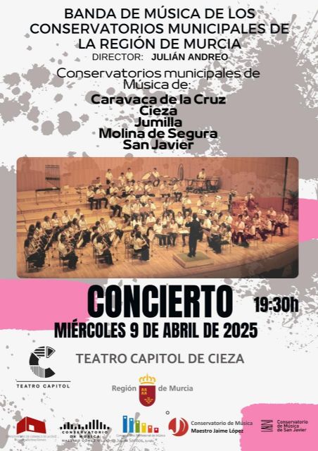 Con el objetivo de proporcionar a los estudiantes una experiencia pedagógica única y complementaria a su formación habitual en las aulas, crear lazos entre los cinco conservatorios municipales de la Región de Murcia, a través del trabajo conjunto de alumnado y docentes, o el desarrollo artístico y social, se presenta el concierto de la Banda de Música de los Conservatorios Municipales de la Región de Murcia, dirigida por el maestro Julián Andreo, y que tendrá lugar HOY miércoles 9 de abril, a las 19.30 horas, en el Teatro Capitol de Cieza. La entrada es libre, hasta completar aforo.