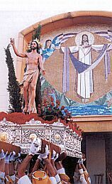 La Cofradía de la Resurrección tiene su sede en la parroquia del Sagrado Corazón de Jesús y está integrada por más de 400 nazarenos, que visten con túnicas blancas y tocados de diferente color según la Hermandad a la que pertenezcan. La procesión del domingo cuenta con los siete niños de las parroquias que desfilarán con dalmáticas semejantes a las que viste San Vicente Mártir, patrón de la ciudad, y a los que se les conoce popularmente como los sanvicentiquios.