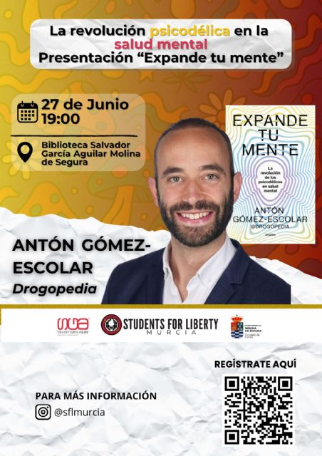 La presentación del libro Expande tu mente, del escritor Antón Gómez-Escolar, tendrá lugar el viernes 27 de junio, a las 19.00 horas, en la Biblioteca Salvador García Aguilar (en Avenida del Chorrico, n° 44). Nos acerca al escritor la asociación Students for Liberty Murcia, y lo presentarán sus coordinadores Bernardino Azarías Ferrer Lozano y Cecilia Atenza López.