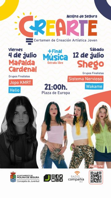 El ganador de la edición del CREARTE 2025 en la modalidad de música se decidirá en dos finales, que se llevarán a cabo el viernes 4 y sábado 12 de julio, ambas en la Plaza de Europa de Molina de Segura, a las 21.00 horas. La Concejalía de Juventud informa que Jopo KMRT, Helio, Sistema Nervioso y Wakame son los artistas finalistas del certamen.