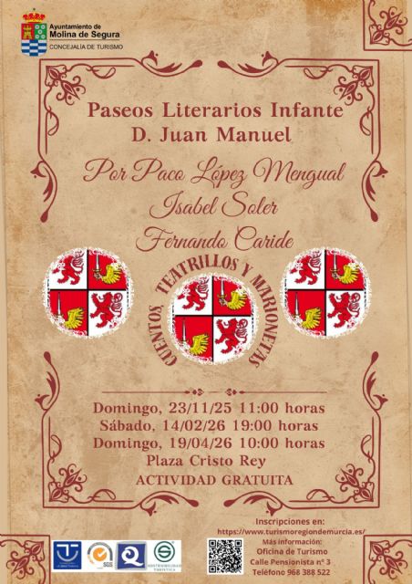 La Concejalía de Turismo del Ayuntamiento de Molina de Segura organiza, en una nueva convocatoria, 3 Paseos literarios con el Infante don Juan Manuel por el Barrio del Castillo, actividad que será llevada a cabo de la mano de Paco López Mengual, Fernando Caride e Isabel Soler Luján, en tres sesiones de noviembre de 2025 a abril de 2026.