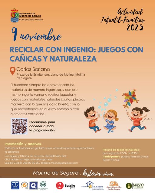 La actividad Reciclar con ingenio: juegos con cañicas y naturaleza, organizado por la Concejalía de Turismo del Ayuntamiento de Molina de Segura, se realizará el domingo 9 de noviembre, de 11.30 a 13.30 horas, en el Museo Etnográfico Carlos Soriano de la pedanía El Llano..