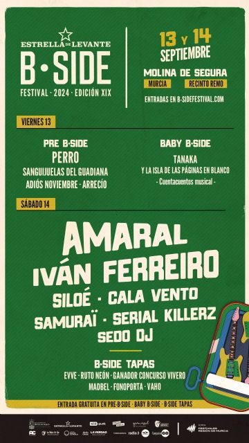 Este año el cartel tiene una programacion potente que se complementa con actividades paralelas y como novedad, aunque ya es tónica habitual en B-SIDE, la inclusividad toma un mayor protagonismo en el festival. Este año ya se puede anunciar que el sábado 14 de septiembre AMARAL ofrecerá un concierto interpretado con lenguaje de signos y subtitulado para hacer mas accesible a tod@s el festival. También actuarán IVÁN FERREIRO, SILOÉ, CALA VENTO, SAMURAÏ, SERIAL KILLERZ y SEDO Dj. El mismo sábado en el escenario del B-SIDE Tapas actuarán Evve, Ruto Neón, Fonoporta, Vaho y el ganador del concurso Vivero Madbel.